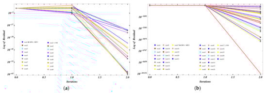 (a–f) shows the residual error graph of the simultaneous method MN1–MN3 and NN for polynomial equations used in examples 1–6, respectively.