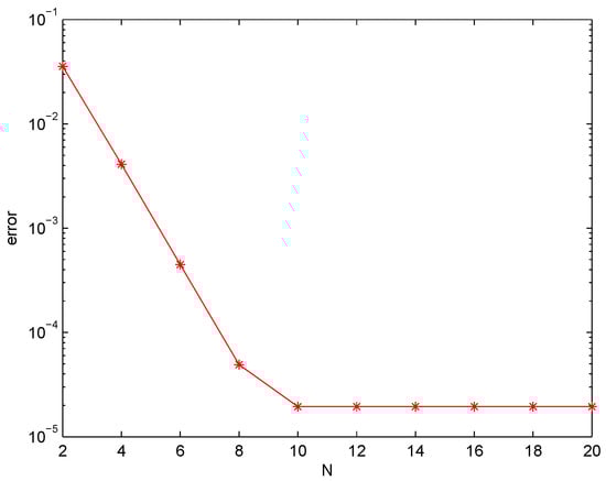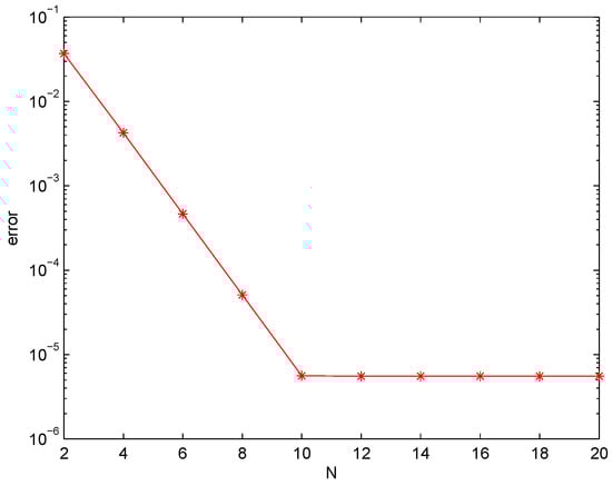 Finally, choosing and , we verified the convergence rate in the spatial direction with respect to the polynomial degree N. Figure 1 and Figure 2 plot the maximum errors in the -norm for different and in the semi-log scale by taking . It shows that the errors exponentially decay, namely the spectral accuracy in the spatial direction was obtained.