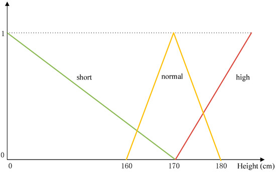 According to Equation (4), when a person’s height is 170 cm, by inputting 170 into the three functions , , and , and using vector notation to represent the membership functions , the fuzzy set representation of the height 170 cm is . When a person’s height is 175 cm, the fuzzy set membership function representation for height is . The membership functions of the fuzzy set can indicate the state of the height. In the “Tall” membership set, the heights and demonstrate that 175 cm fits the designation “Tall” more than 170 cm does. Simultaneously, in and , it indicates a higher conformity with the label “Medium” among the three labels in the fuzzy sets of . A schematic of the fuzzy set membership functions for height is shown in Figure 1.