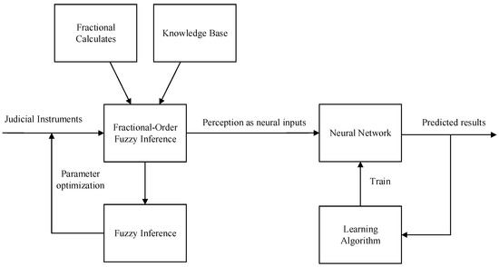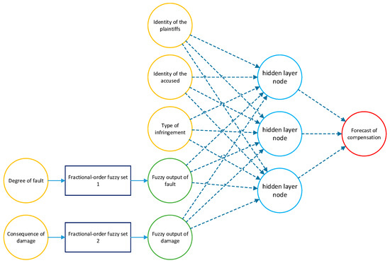 The fractional-order fuzzy neural network system is designed to address the fuzziness in describing the impact scope, consequences, and degrees of fault in cases of infringement within the dataset of the right to honor. In judicial documents, these descriptions often exhibit ambiguity, making it challenging for traditional neural networks to handle such unstructured and fuzzy input features. Therefore, fractional-order fuzzy membership functions are utilized to depict the infringement behaviors, consequences, and degrees of fault in the infringement dataset. The outputs of fractional-order fuzzy membership functions serve as inputs for neural network predictions, enabling the prediction of judgments in cases of infringement of the right to honor. The overall structure of the system is illustrated in the following diagram (Figure 3).