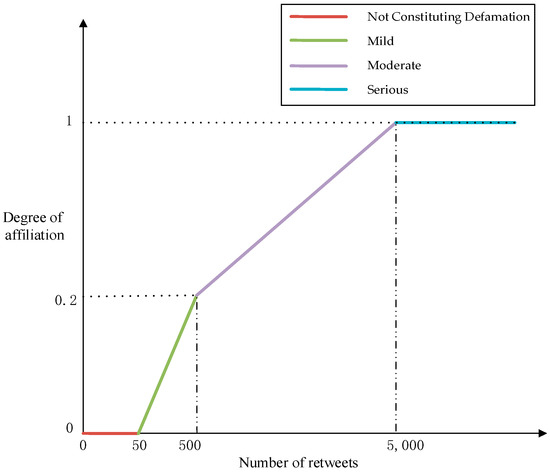 As shown in Table 3, according to the interpretation by the Supreme People’s Court of the People’s Republic of China regarding crimes committed via information networks, the degree of forwarding defamatory and infringing information on the internet can serve as a reference. We can create a fuzzy membership function to represent the “degree of seriousness” of reputation infringement, where the input variable represents the number of times defamatory information is viewed on the internet.