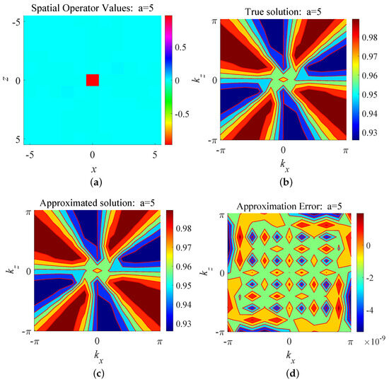 We present a calculated generalized fractional convolution stencil for a case with , and and compare the corresponding true and approximated pseudo-differential operators in Figure 1. As shown in Figure 1, the coefficient of the central point in the fractional convolution stencil is dominant, and the relative error is only about . This indicates that the proposed approximation method can accurately generate a fractional convolution stencil to approximate the spatial-domain fractional pseudo-differential operator.