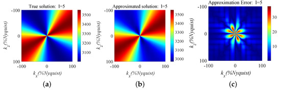 Comparisons of the true and approximated phase velocity for a case with v = 3000 m/s, , and . (a) The phase velocity calculated using the exact operator, (b) the phase velocity calculated using the approximated operator and (c) the difference between (a) and (b).