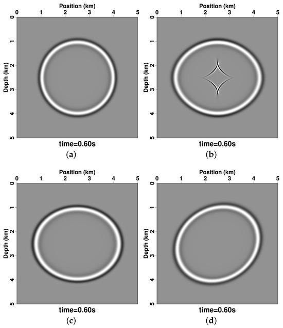 Wavefields of isotropic, VTI and TTI modeling at 0.6 s for a case with v = 3000 m/s, , and . (a) Isotropic wavefield, (b) VTI wavefield simulated using the coupled quasi-P wave equations, (c) VTI wavefield simulated using the proposed approach and (d) TTI wavefield simulated using the proposed approach.