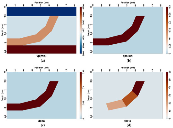 P-wave velocity (a), (b), (c) and (d) for the Marmousi TTI model.