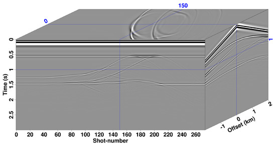 To further verify the feasibility and effectiveness of the proposed method, we conducted RTM experiments using the proposed TI RTM methods on a modified 2007 BP TTI model (Figure 7). As shown in Figure 7, an intrusive rock mass with isotropic properties is depicted, and the variations in dip angle near this rock mass are very pronounced, posing a significant challenge for underground imaging. The 2007 BP TTI model was discretized with a grid of 500 × 361, with a spatial increment of 10 m. In total, 166 explosive sources with a 25 Hz Ricker wavelet were evenly distributed on the surface, with a spacing of 30 m. In addition, 400 receivers were evenly distributed on the surface. The recording duration was 4 s, with a time sample interval of 0.5 ms. Shot gathers are shown in Figure 8. The migration images acquired through isotropic, VTI and TTI RTM are presented in Figure 9. The reflectors near the intrusive rock mass in the isotropic and VTI images are severely distorted and misplaced due to the steep dip angles, as indicated by the red arrows in Figure 9a,b. Moreover, neglecting the anisotropy also degrades and distorts images in the root regions of the intrusive rock mass (circled regions in Figure 9a,b). On the contrary, the proposed TTI RTM can correct the distortion in seismic wave propagation in TTI media, producing clear images with accurate kinematic information and focused events (Figure 9c).
