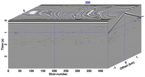 In this experiment, we used the modified Marmousi TTI model to assess the adaptability of the proposed quasi-P-wave imaging method for complex structures. Velocity and anisotropy models are presented in Figure 10. A total of 433 shots were set with a spacing of 22.5 m. Each shot was recorded using 400 receivers spaced 7.5 m apart, covering an aperture of 3 km. The recording duration was 4 s, with a time sample interval of 0.5 ms. The source’s time function was a Ricker wavelet. The peak frequency was 20 Hz. The synthetic shot gathers are shown in Figure 11. Migrated images using isotropic, VTI and TTI RTM are presented in Figure 12. The isotropic and VTI images for the faults and associated faulted blocks appear distorted and misplaced, as shown in Figure 12a,b. Moreover, the reflectors within the anticline exhibit low amplitudes and are contaminated by migration noises. After correcting the effects of anisotropy, the faults and associated faulted blocks are well imaged, and the reflectors within the anticline reservoir become more continuous and easily interpretable (Figure 12c).