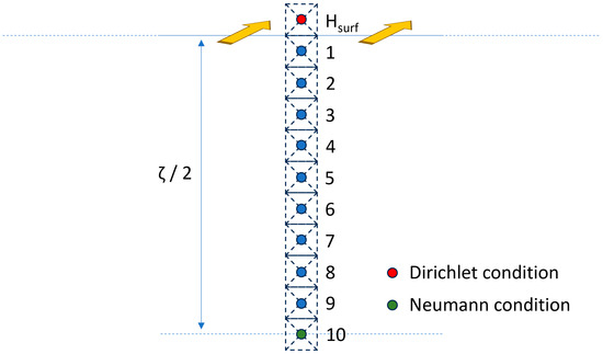 Since H(x,t) and B(x,t) are symmetric about the plane x = ζ/2, a resolution of Equation (13) on the segment [0, ζ/2] is enough, and a Neumann condition can be applied for the x = ζ/2 node (see Figure 1 for illustration). In this condition, r, the space discretization in Equation (14), is worth ζ/[2(N − 1)], where N is the number of nodes.