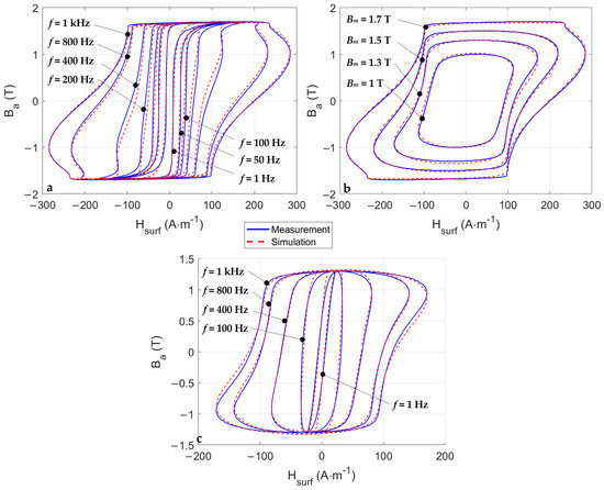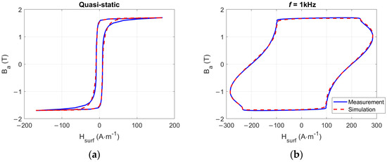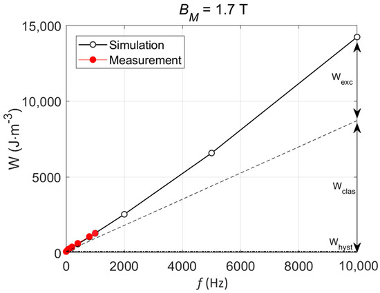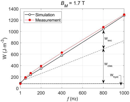 This subsection is dedicated to the validation of the simulation method; a comparison between the simulation and measurement is depicted in Figure 3. Experimental measurements were undertaken under controlled sinusoidal magnetization for the frequency range of 50 Hz to 1 kHz and peak flux density from 1.0 T to 1.7 T. This range was determined based on the magnetic flux density at which the material can potentially operate when converting electrical energy to mechanical energy, or vice versa, in typical electromagnetic devices such as transformers, electric motors, and generators [7].