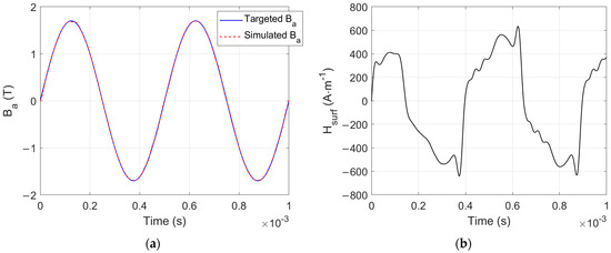 (a) Comparison between the targeted and the simulated flux density at the end of the P−ILC process (f = 2 kHz), (b) H(t) related surface field.