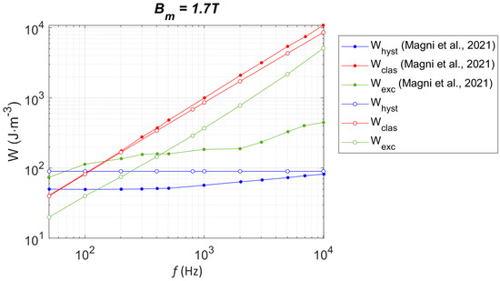 A relatively close behavior between Whyst and Wclass contributions is visible. The slight increase in Whyst, when f increases in [44], can be attributed to a higher level of B on the edge layers, but this behavior does not happen in our simulation method, where the static contribution illustrated in Figure 4b is always very saturated, even in a lower level of frequency. The most noticeable difference comes from the evolution of Wexc, which increases at a much lower rate in [44] than in our simulation method. The low level of Wexc in [44] is attributed to the significant skin effect in the high-frequency range (f > 200 Hz) and the absence of magnetization in the center of the tested lamination. At 1 kHz, where our simulation method has been validated through comparison with experimental results, our Wexc contribution is already three times larger than that of [44]. This difference could be attributed to the different grades of oriented grain electrical steel tested. Unfortunately, in [44], no experimental result at 1 kHz could validate this hypothesis. Finally, a slight deviation in excess loss is observable in our simulation results for the high level of f. This observation should be confirmed experimentally in future studies. Although differences can be observed in the prediction of the excess loss frequency dependency (Figure 11), the close behavior of the classic and hysteresis losses, combined with the excellent simulation results shown in Figure 2 and Figure 3, can be considered as a solid validation of our simulation method.