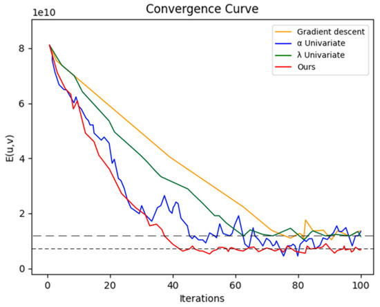 Comparison plots of convergence curves of numerical iterations using gradient descent method, univariate iteration ( or ), and multivariate iteration (ours) based on the objective function of this paper when the number of iterations is set to 100 for random pixels.