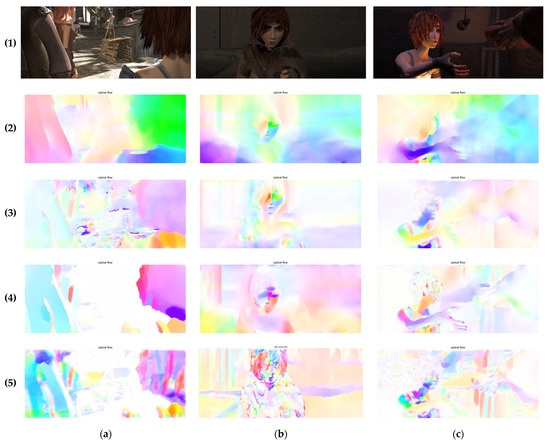 Visualization of optical flow estimation. (a) Sequence 1; (b) Sequence 2; (c) Sequence 3.