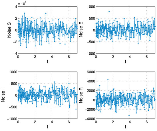 The noise (), added to the numerical solution of the direct problem in order to generate in (30), Example 4.