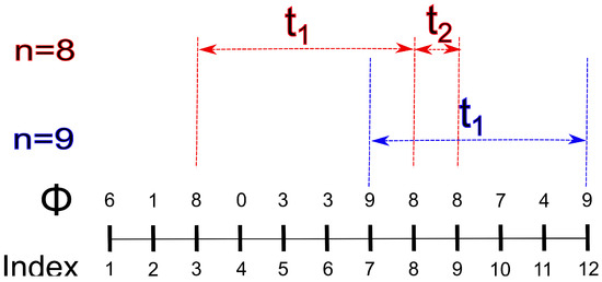 Schematic diagram to demonstrate the concept of inter-event time using the mantissa of . The inter-event times for two digits 8 (red) and 9 (blue) in the mantissa of are used as examples in the figure.