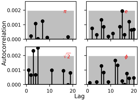 One potential approach for generation of random numbers is using the digits of irrational numbers. Irrational numbers are numbers that cannot be explicitly represented as a simple fraction in the form , where are integers and . Certain irrational numbers arise from the roots of polynomials with integer coefficients, although numerous others do not. Some common irrational numbers include the golden ratio ()), pi (), Euler’s number (e), and many others. The golden ratio is regarded as the most irrational of all irrational numbers because it has the slowest convergence of the optimal approximation by a sequence of rational numbers which is given by the continued fraction expansion [10,11]. Pi () expressed as is an important number in science, especially geometry and trigonometry. Euler’s number (e), expressed as , has applications in complex number theory, probability distribution, and differential equations. The square root of 2 () is defined as the length of a diagonal across a square with sides of one unit of length. has the sequence . It was used in the ground plan of the Norwich Cathedral [12] and the design of paper sizes [13]. The golden ratio () is expressed as (). It has the form . The sequence has applications in arts, flowering plants, and construction of the great pyramid [14]. One of the practical applications of irrational numbers is in the field of cryptography. Irrational numbers have been used to improve on the efficiency of the Data Encryption Standard [2]. Liu et al. [15] proposed a new method to generate a random phase mask for information encoding using the decimal expansion of irrational numbers. It has been reported that transforming the digits of irrational number to binary sequences can generate random sequences with applications to cryptography [5]. Statistical tests have shown that can be used as a random number generator [16]. The application of irrational numbers depends on whether they are stochastic or chaotic.