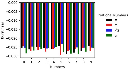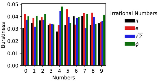 Burstiness value of each digit of the four irrational numbers to determine their statistical characteristics.