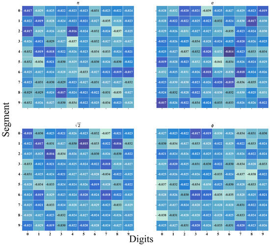 This study also considered the distribution of the inter-event statistics across different segments of the irrational numbers. To achieve this, the 1,000,000 digits were divided into segments of 100,000 digits each and burstiness analysis was conducted for each digit within the segments for the four irrational numbers. The result is shown in Figure 4. In the four irrational numbers studied, there were no discernible patterns in Burstiness across the 10 segments for each of the digits. All the values were found to be close to zero, which confirms that the distribution of the inter-event times across the different intervals are Poisson processes. This confirms the independence and time homogeneity in the inter-event times. The burstiness values were found to be in the range , , , and for , e, , and , respectively. The lack of symmetry in the burstiness measures across the different segments also suggests that the four irrational numbers considered have digits with different dynamical structures.