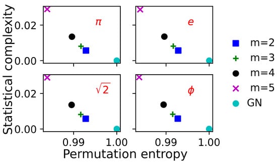 The complexity–entropy plane analysis was conducted on the time series of the four irrational numbers at different embedding dimensions for the permutation entropy (Figure 7). It is pertinent to note that there were no significant differences between the complexity–entropy planes for the four irrational numbers at various embedding dimensions. The statistical complexity values were found to be low (0.00–0.025) and permutation entropy was high (0.98–0.995). The statistical complexity increases while the permutation entropy decreases with increasing embedding dimensions. The complexity–entropy values for the four irrational numbers at different embedding dimensions were compared to those of Gaussian noise, as a reference. It was observed that the complexity of the four irrational numbers is not different from that of a Gaussian noise.