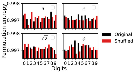 Temporal dependence structure and degree of complexity in inter-event times of the four irrational numbers and their shuffled versions were determined using permutation entropy (Figure 8). It was observed that there were no significant differences between the original and shuffled versions of the inter-event times of each digit in the four irrational numbers. In some instances, the permutation entropy of the shuffled data was found to be slightly higher than that of the original data. This implies that shuffling the inter-event times increased the complexity of the time series. Furthermore, there were no differences in the permutation entropy values of the inter-event times for each of the digits in the four irrational numbers. That is, the values of permutation entropy were in the same range for all the irrational numbers. Hence, it is not sufficient to differentiate the level of complexity among the digits or the numbers. Variations in the original inter-event times for each digit of the four irrational numbers were found to show no trend or pattern except for . For , the permutation entropy increases from 0 to a peak at 3 before decreasing to a minimum value at 9.