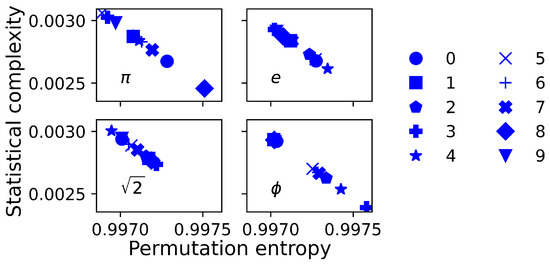 The inter-event times for integers in the four irrational numbers were also examined in the complexity–entropy plane (Figure 9). The complexity–entropy plane for these digits is characterised by high permutation entropy (≥0.996) and low statistical complexity (≤0.0031). These values are associated with Gaussian processes [17]. Clusterings were observed in the complexity–entropy planes. In the complexity–entropy plane for , there are five distinct groups. The first group consisting of 5, 3, and 9 have the highest values of statistical complexities. In the second group lies 2, 1, 4, 8. The third, fourth, and fifth group consists of one digit each—7, 0, and 8, respectively. The clustering of these digits suggests identical dynamical characteristics for their inter-event times. In the complexity–entropy plane for e, two distinct groups could be observed. The first group consists of 3, 9, 8,7, and 1, while the second group has 0, 2, 6, 5, and 4. There were no clear clusters in the complexity–entropy plane for ; hence, it is posited that all the digits showed the same level of complexity. Four clusters could be observed in the complexity–entropy plane for . There is the first cluster with the highest statistical complexity consisting of 0, 1, 8, and 9 while the second group has 2, 5, 6, and 7. The third and fourth cluster has one member—4 and 3, respectively.