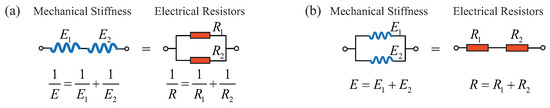 Schematic of the force–electricity analogy. (a) The stiffness interaction among mechanically series-connected elements is similar to the behavior of electrical resistors in a parallel configuration; (b) conversely, the stiffness of mechanically parallel-connected elements corresponds to electrical resistors arranged in series.