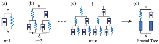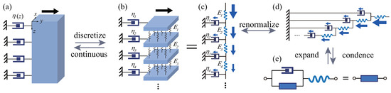 Figure 9a,b depict an elastic body under lateral forces at its upper boundary, experiencing shear deformation that initiates force transmission from top to bottom. By dividing the body vertically (z-direction) into thin slices (each with thickness ), it transitions from a continuous entity (Figure 9a) to a discrete system (Figure 9b), where slices are linked by elastic elements and to boundaries by viscous elements, allowing force to propagate through springs and dashpots. This setup leads to the multi-level self-similar model in Figure 9c: applied forces traverse internal elastic components, bifurcating at each level—one path through dashpots to boundaries and the other to subsequent elastic layers. This repetitive sequence crafts a layered mesh of elastic and viscous connections. Drawing on this model, Schiessel and Blumen [16,17], Heymans et al. [18,19], and Mario Di Paola et al. [31] introduced a pivotal transformation relationship, correlating the body’s internal elastic constants with the external viscous constraints’ viscosity coefficients by