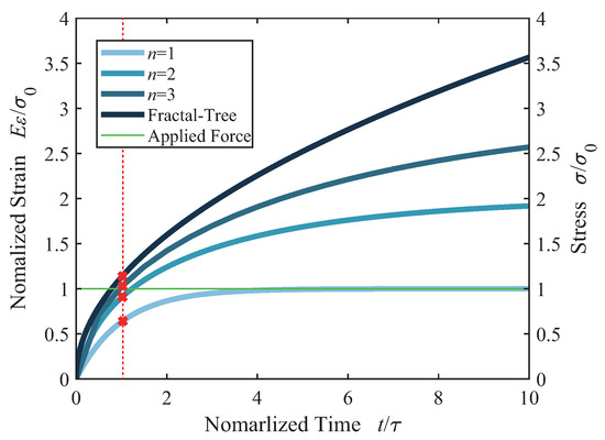Figure 7 illustrates the creep response of structures from levels 1 to 3 compared to an infinite-level structure. With the increase in structural levels, the multi-level structure’s creep curves rapidly converge to the fractal tree within a characteristic time range, as indicated by the red dashed line. The findings suggest that, as the hierarchy of a finite-level structure extends beyond three levels, its mechanical behavior within the characteristic time can be represented by an infinite-level structure. Additionally, the analytical process for determining the behavior of an infinite-level structure proves to be simpler than for a finite-level structure, thus enhancing the model’s practical applicability in viscoelastic investigations. Moreover, the level-1 Voigt model entirely lacks the long-term relaxation effect. The greater the number of structural levels, the more pronounced the long-term relaxation effect becomes. An infinite-level fractal structure exhibits the most pronounced characteristics of ultra-long relaxation time. This discovery holds significant importance for understanding the mechanical behavior of complex viscoelastic materials.