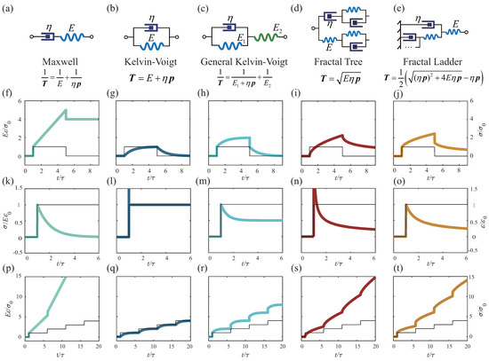 Quasi-static responses of classical viscoelastic models and fractional viscoelastic models. (a–e) Schematic diagrams and operator expressions of classical linear viscoelastic models and fractal viscoelastic models. (f–j) Creep function curves of the structures, with black line segments indicating applied step stress, loaded at time and unloaded at time . The horizontal axis represents dimensionless time, while the vertical axis represents the dimensionless creep function. (k–o) Relaxation function curves, with black line segments indicating applied step strain, loaded at time . The vertical axis is dimensionless stress. (p–t) Creep curves under multiple loading cycles, with black line segments indicating applied step stress, loaded at time .