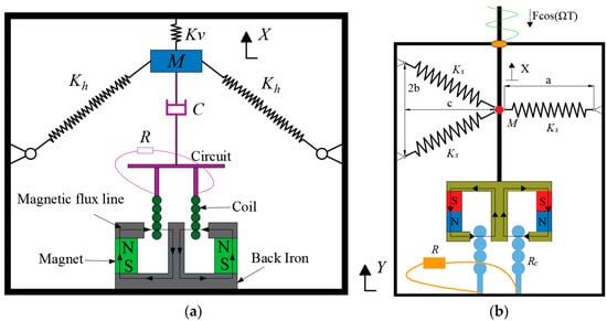 Obliquely set-up springs in electromagnetic VEHs: (a) VEH with a pair of springs (SD oscillator); (b) VEH with three springs.