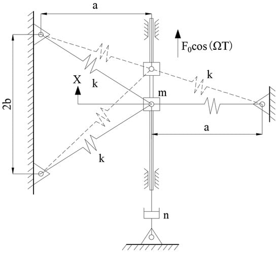 The oscillator under consideration consists of one collar and three elastic springs [27], as shown in Figure 2. It is a typical primary structure of vibration isolators [4,5] and VEHs [7,10]. Here, the collar with the mass m can move on the vertical slider with the linear damper n. Each spring is connected to the collar by a smooth pin on one end and is fixed to the base by a pin on the other end. Two springs on the left of the collar are initially inclined, while the spring on the right of the collar is initially horizontal. The stiffness and the initial length of the three springs are k and l, respectively. The structural parameters a and b represent the horizontal distance between the collar and each fixed pin and half the vertical distance between the two fixed pins connecting the tilted springs. Since the size of the collar is so small, it can be considered a lumped mass. Under harmonic excitation , its displacement, velocity and acceleration at time t are denoted by , and , respectively. According to Newton’s Second Law, the dynamic system of the collar can be expressed as follows: