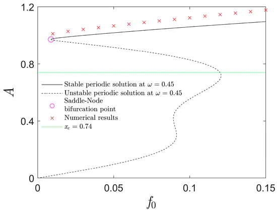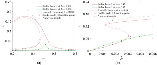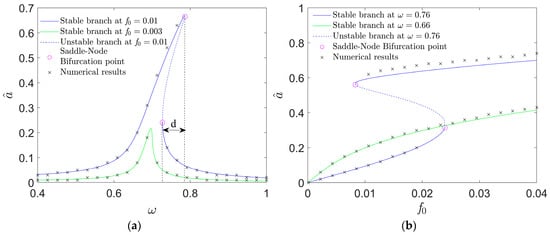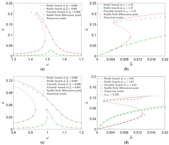 Based upon Equations (21)–(23), Figure 4 can be plotted to depict the amplitude variations in the resonant responses with the excitation. Via the fourth Runge–Kutta approach and the software MATLAB2018a, numerical results are provided (see the cross signs in Figure 4). As they match the analytical solution branches well, the accuracy of the prediction is validated.