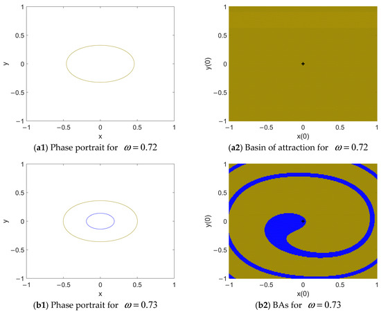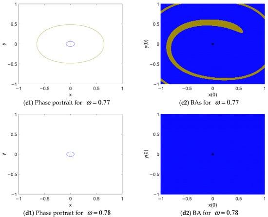 In Figure 5(a1), there is only one periodic attractor. So, it is globally attractive, as shown in the BA of Figure 5(a2). A little increase in leads to the occurrence of a new attractor with a much lower amplitude (see the dark yellow portrait in Figure 5(b1)). Even though its BA is very small, the vicinity of O(0, 0) (see the black cross in Figure 5(b2)) is eroded by its BA. Since most of the time, the initial conditions of the system are within the neighborhood of the fixed point, the lower-amplitude response has a high probability of being the final response. When is increased to 0.77, the higher-amplitude response becomes the hidden attractor [30] as its BA is beyond the vicinity of O(0, 0) (see Figure 5(c2)). A further increase in leads to the vanishing of the higher-amplitude response and the global attraction of the lower-amplitude one, as shown in Figure 5(d1,d2).