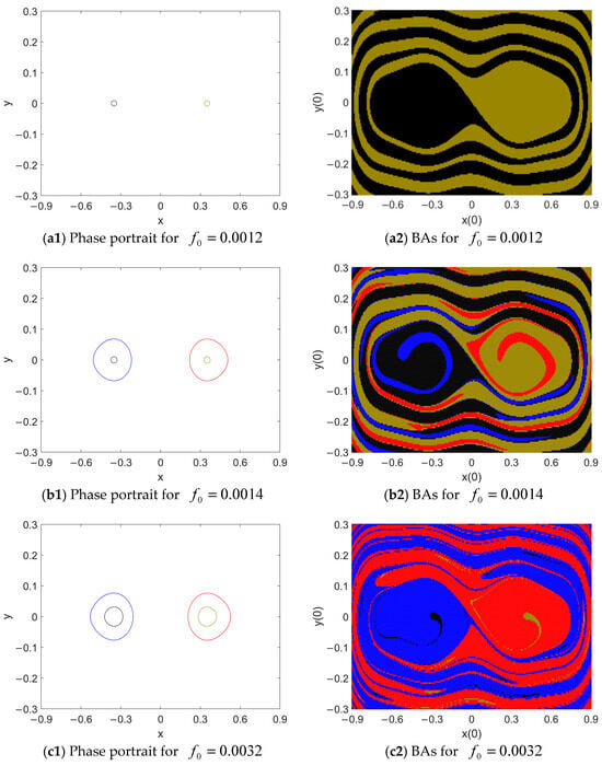 To begin with this, for , around each well center, there is an intra-well periodic response whose amplitude is very low (see Figure 8(a1)). The BA of each response has a smooth boundary and is continuous in the vicinity of the corresponding nontrivial center (see Figure 8(a2)), showing the local attraction of each response.