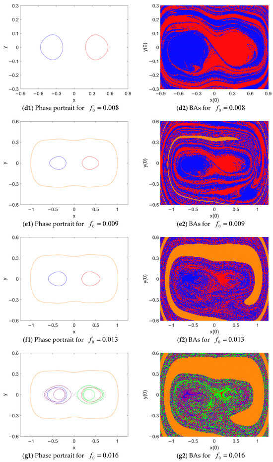 For , the lower-amplitude responses around disappear, and the higher-amplitude intra-well responses become locally attractive (see Figure 11(e1,e2)). Still, the inter-well responses are rare and hidden attractors. As reaches 0.011, the inter-well attractors vanish, and the other attractors and their BAs are nearly unchanged, as illustrated in Figure 11(f1,f2).