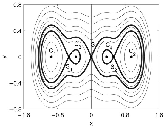 Considering the case of quadruple potential wells, we set . Based on Equation (5), the unperturbed orbits are illustrated in Figure 9. The positions of four potential well centers, as well as three saddle points, are provided in Table 1. In this section, we concentrate on the analyses of the intra-well periodic responses and numerical simulations concerning the coexisting responses and their BAs in the case of quadruple wells.