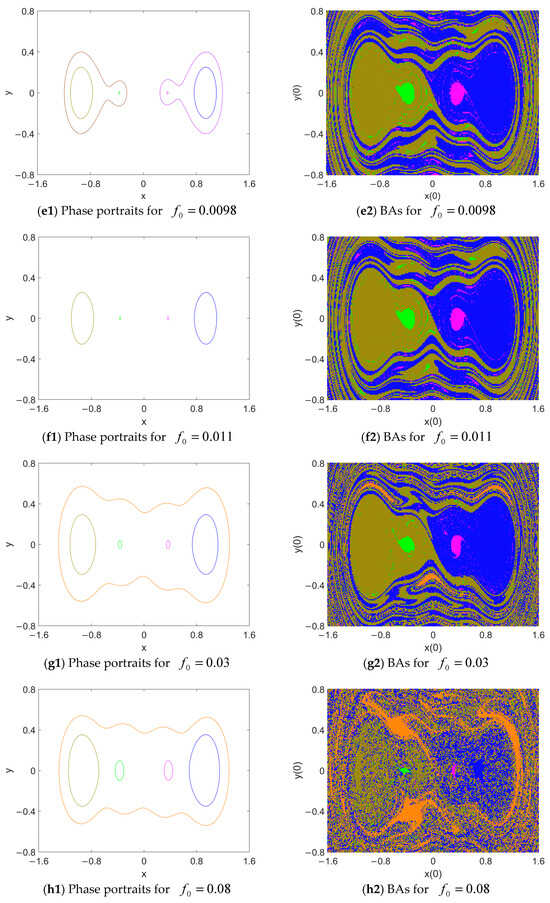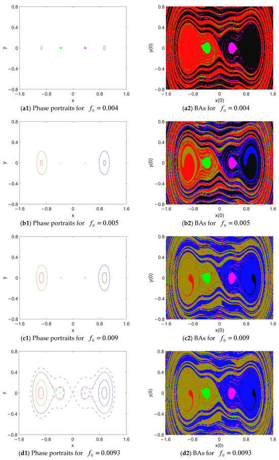 Given that and , the evolution of the responses and their BAs with the rise in is illustrated in Figure 11. Here, the BAs of the responses are classified in the initial-state plane , . For each response, its phase map and BA are marked in the same color. For , according to the analysis, the four well centers of the unperturbed system are fixed points. Therefore, the initial state of system (3) is disturbed from these positions.