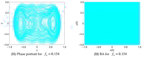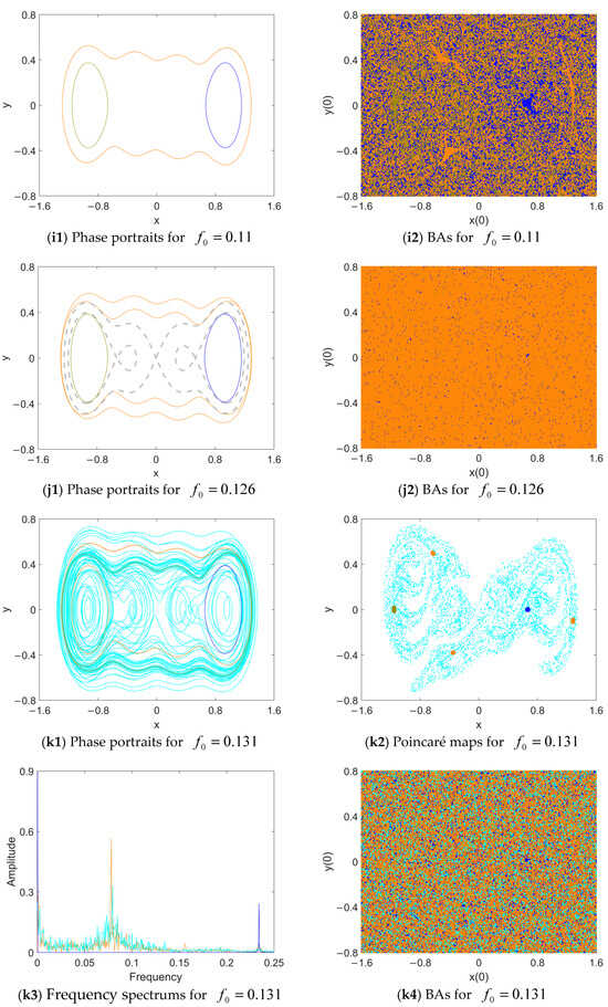 As continues to increase, the BA of the inter-well periodic response is enlarged with a smooth boundary (see Figure 8(f2,g2,h2). Coexisting with the symmetric intra-well periodic attractors, complex attractors such as intra-well period-3 attractors (see Figure 8(g1)), chaos (see Figure 8(h1,h3,h4)) and the inter-well period-4 attractor (see Figure 8(i1)) occur successively. Their BAs are segmented into fractal and discrete pieces, illustrating how all the complex attractors have severely fractal BAs. Therefore, when the initial conditions are disturbed from the fixed point , it is hard to determine the final dynamics of the system (3). Unlike the chaotic response, it is another type of initial-sensitive phenomenon.