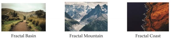 Irregular phenomena are present in nature with manifestations of great complexity. As traditional geometry did not allow for their examination, a language was required to describe them. Mandelbrot gave the name of fractal geometry to this language and defined it as a semi-geometric object whose basic structure, fragmented or irregular, is repeated at different scales [,]. Falconer [] defined the following properties for fractal shapes: too irregular to be described in traditional Euclidean geometric terms; it has details at any scale of observation, so, if the fractalization or the degree of detail in the geometry tends to infinity, it is impossible to measure it since the length of a fractal curve iterated to infinity, contained in a finite area, is infinite, an absent characteristic in traditional geometry; its Hausdorff–Besicovitch dimension is strictly greater than its topological dimension, and this dimension is a way of measuring the fractal dimension or fragmentation of the geometry under study and gives an idea of how it occupies the space in which it is contained; and it has self-similarity, whether exact, quasi-self-similarity, or statistical, since it is created from a recursive method developing complex structures, which is the reason for the abundance of fractals in nature (geological processes, development of biological structures, etc.). Figure 1 shows geomorphologies with a fractal design: