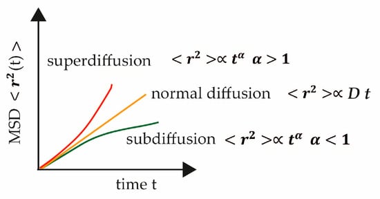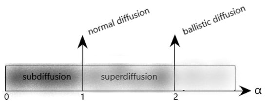 Anomalous diffusion, according to the mean square displacement, Equation (11), with subdiffusion for 0 < α < 1 (left area of the figure) and superdiffusion for α > 1 (from the intermediate area to the right of the same figure). At the limit between both zones is the normal Brownian diffusion (special case: ballistic motion (α = 2)).