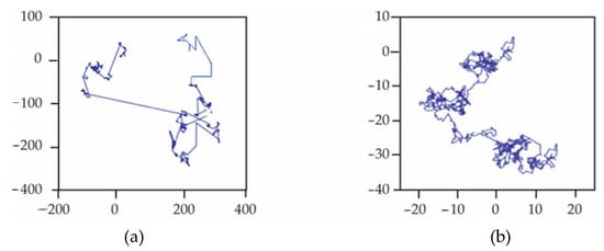 (a) 1000 steps of a Lévy flight in two dimensions; and (b) 1000-step example of an approximation to a two-dimensional Lévy flight type of Brownian motion.