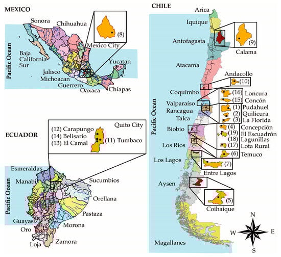 The time series were extracted from three monitoring networks: in Chile, from SINCA (National Air Quality Information System) [], whose data are public; in Mexico, from SINAICA []; and, in Ecuador, from SUIA []. These networks perform real-time measurements of meteorology and pollutants, have a proper distribution, and are reliable and according to international standards, operating for long periods (years) without interruption.