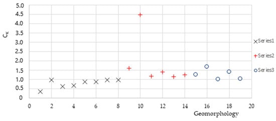 The numerator contains the sum of the entropies of each meteorological variable (T, RH, and WS). The denominator includes the sum of the entropies of each pollutant (PM10, PM2.5, and CO). CK is one per commune (located at different heights, with their monitoring station). CK is dimensionless and is an entropic comparative index of the two interacting systems over a period of 3.25 years.