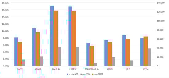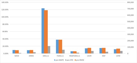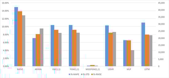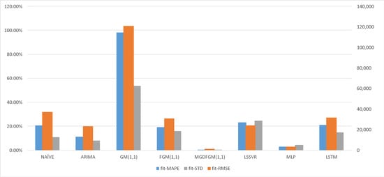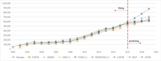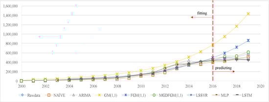| Year | Raw Data | NAÏVE | ARIMA | GM(1,1) | FGM(1,1)0.996 * | MGDFGM(1,1) | LSSVR | MLP | LSTM |