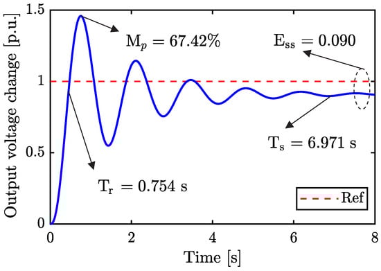 It is noteworthy that such a response presents undesired behaviors, including a high overshoot ( = 67.42%), settling time ( = 6.971 s) and rise time ( = 0.754 s), as well as a considerable steady-state error ( = 0.090 p.u.). Thus, selecting a suitable controller may guide the system dynamics to improve the electrical output features.