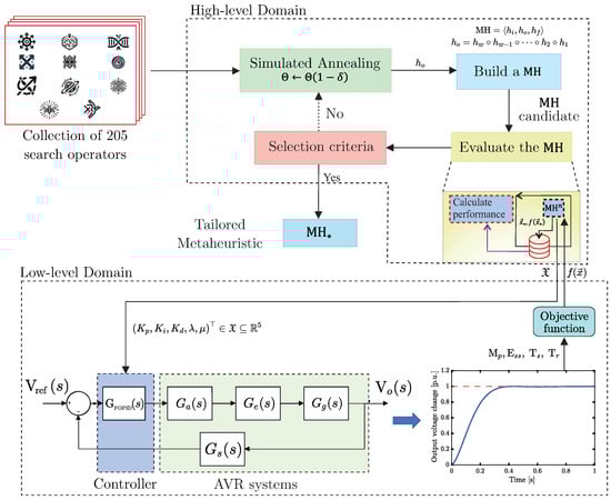 This work uses the model-based category to obtain MHs to solve continuous optimization problems by addressing the Metaheuristic Combinatorial Optimization Problem (MCOP) []. In this case study, the CUSTOMHyS framework generates a tailored MH to tune the FOPID controller for an AVR system. In addition, an Hyper-Heuristic (HH) is employed as a high-level solver for the MCOP, helping to explore the design space to identify efficient configurations. So, an HH can be any algorithm that can achieve a tailored MH by dealing with the following problem,