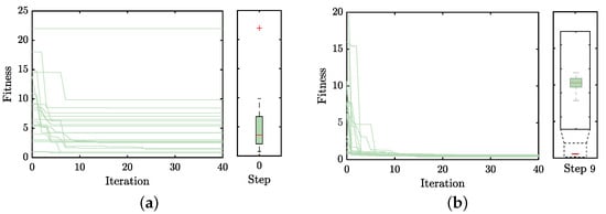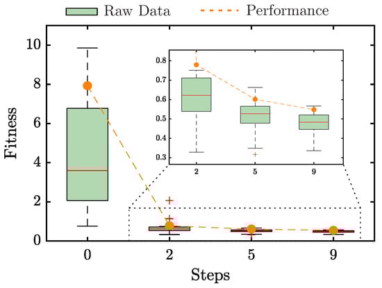 This first stage aims to obtain the MH as it best solves the optimization problem. Figure 4 shows the HH evolution process obtained for this problem. Each boxplot represents the final fitness value for each candidate MH in the replicates to which it was subjected (20 times). In addition, the best performance obtained in the HH process is marked in orange dots. This performance metric is given by Q, presented in (19). The candidate MH went from a value of (step 0) to (step 2), representing an enhancement of 90.17%. Plus, the zoomed box in Figure 4 indicates the steps with a significant improvement. For instance, Q equals 0.61014 at step 5 and decreases to 0.5482 at step 9; these represent 92.30% and 93.08% better values than the initial step, respectively.
