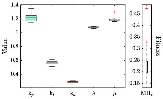 During the second stage, our primary objective was to identify the most suitable FOPID configuration for integration with the AVR system. To this end, the FOPID tuning was performed 50 times using the MH achieved in the previous stage, storing the controller constants and their fitness values. This test verified the repeatability of the optimization process, selecting the best FOPID controller obtained in the different replicates.