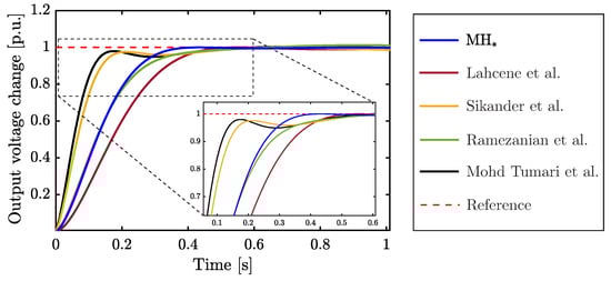Figure 7 illustrates the dynamic responses of the controllers listed in Table 5, tracking a Heaviside step function. Upon closer examination, it becomes evident that the controller fine-tuned through the tailored MH reaches the steady state with remarkable swiftness, showcasing superior performance. This enhanced response is attributed to the meticulously fine-tuned control gains, as detailed in the third row of Table 5, which significantly improve the system’s transient behavior. Besides, our heuristically tuned controller distinctly outperforms the alternatives in three critical control metrics: peak overshoot (), settling time (), and the difference between settling and rise times (). In comparison, the approach by Sikander et al. [], represented by the yellow line in the figure, demonstrates the least favorable performance, positioning it at the lower end of the comparative spectrum.