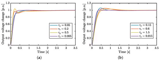 Step responses of the fine-tuned Fractional-Order PID controller under parameter variations of (a) −50% and (b) 50% for each AVR transfer function. , , , and represent the parameters of the amplifier, exciter, generator, and sensor models, respectively (see Table 1).